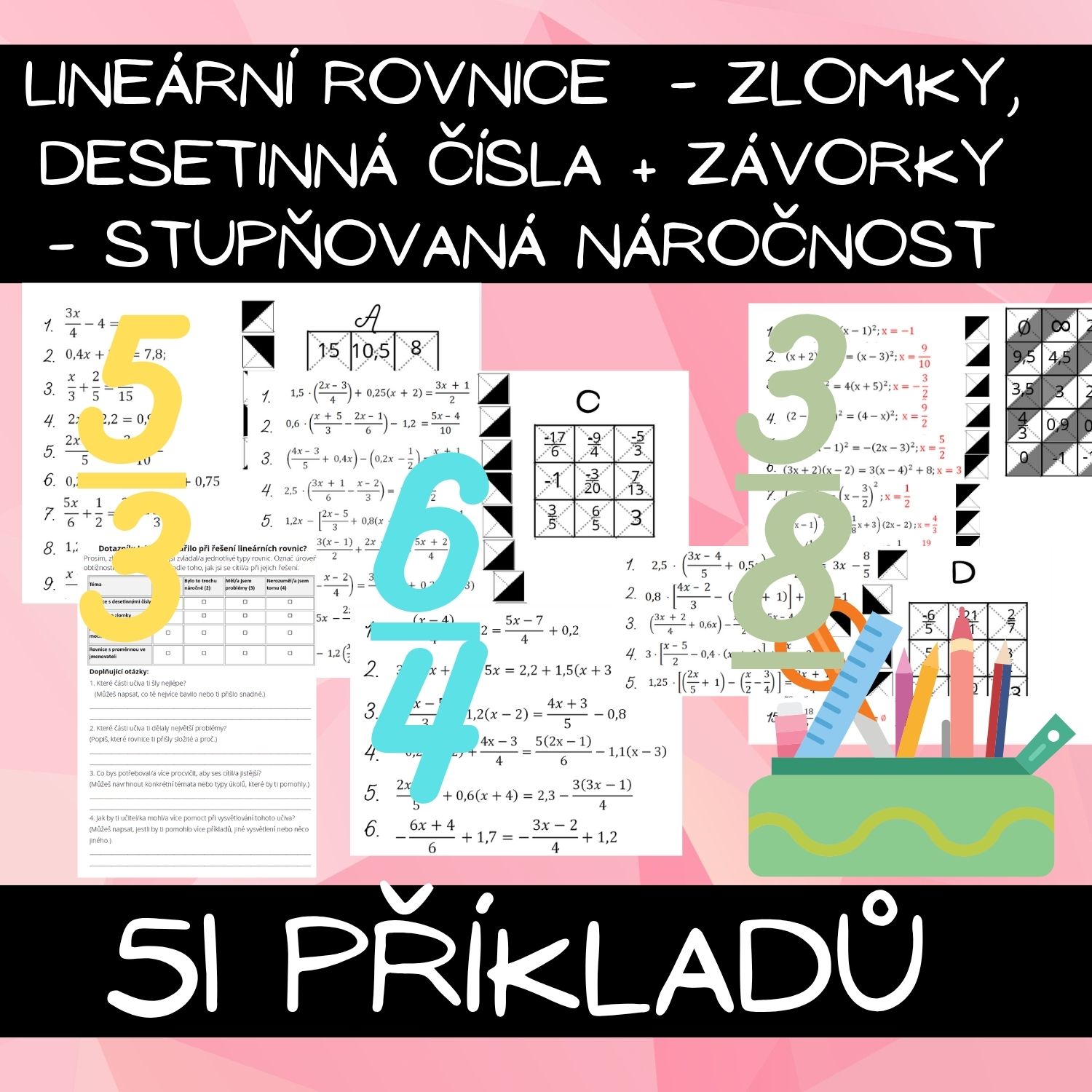 LINEÁRNÍ ROVNICE - ZLOMKY, DESETINNÁ ČÍSLA + ZÁVORKY - STUPŇOVANÁ NÁROČNOST